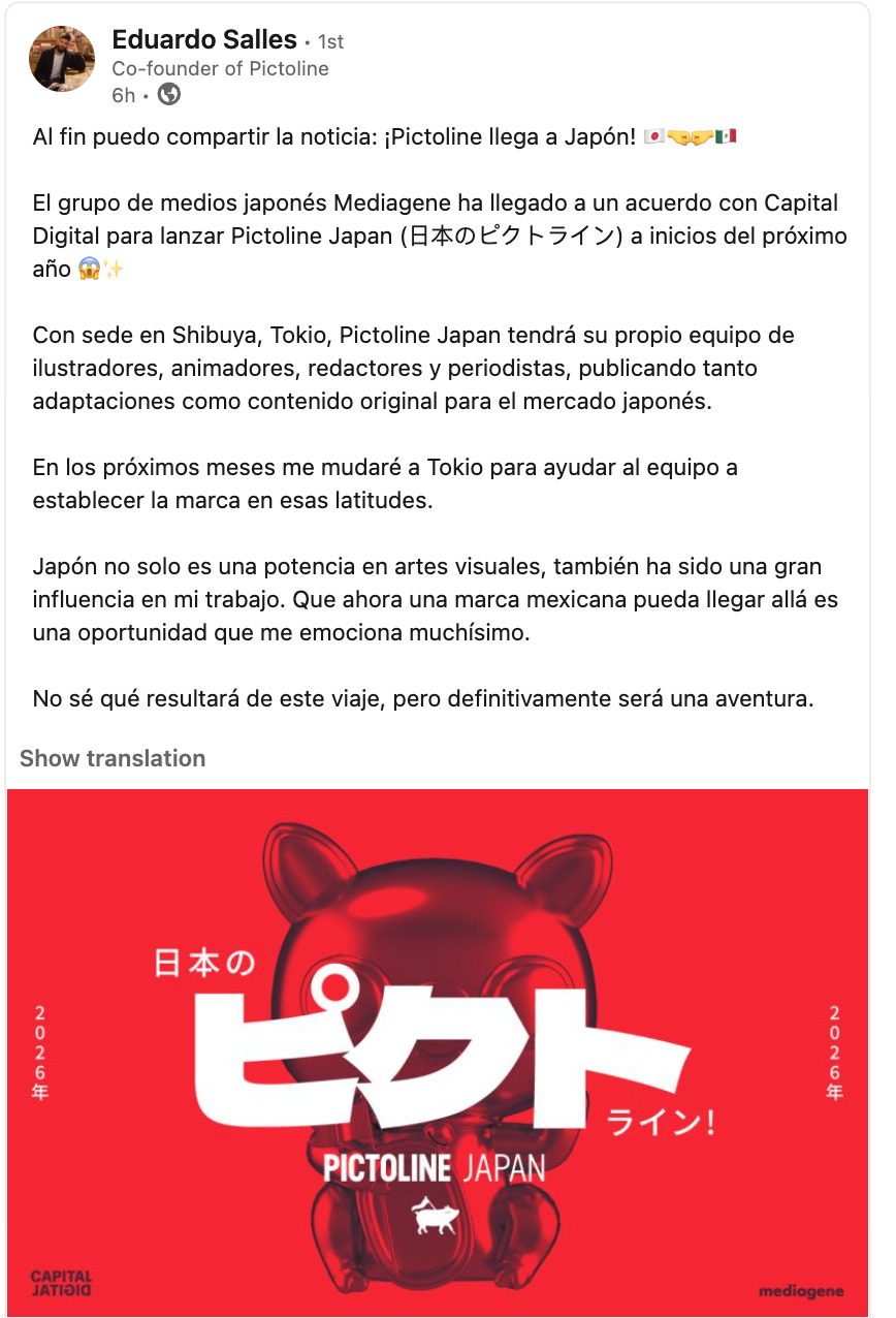 Me cuenta Gustavo Guzmán, director general de Capital Digital y principal accionista, que parte del acuerdo cede una parte de Pictoline a Mediagene en el continente asiático.