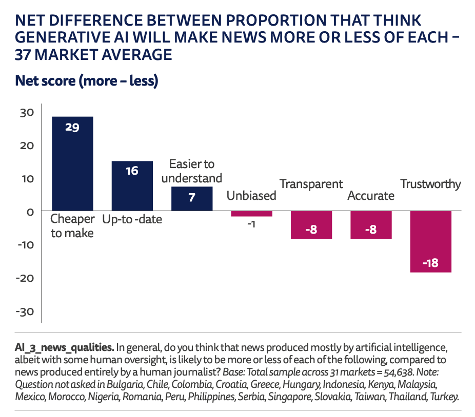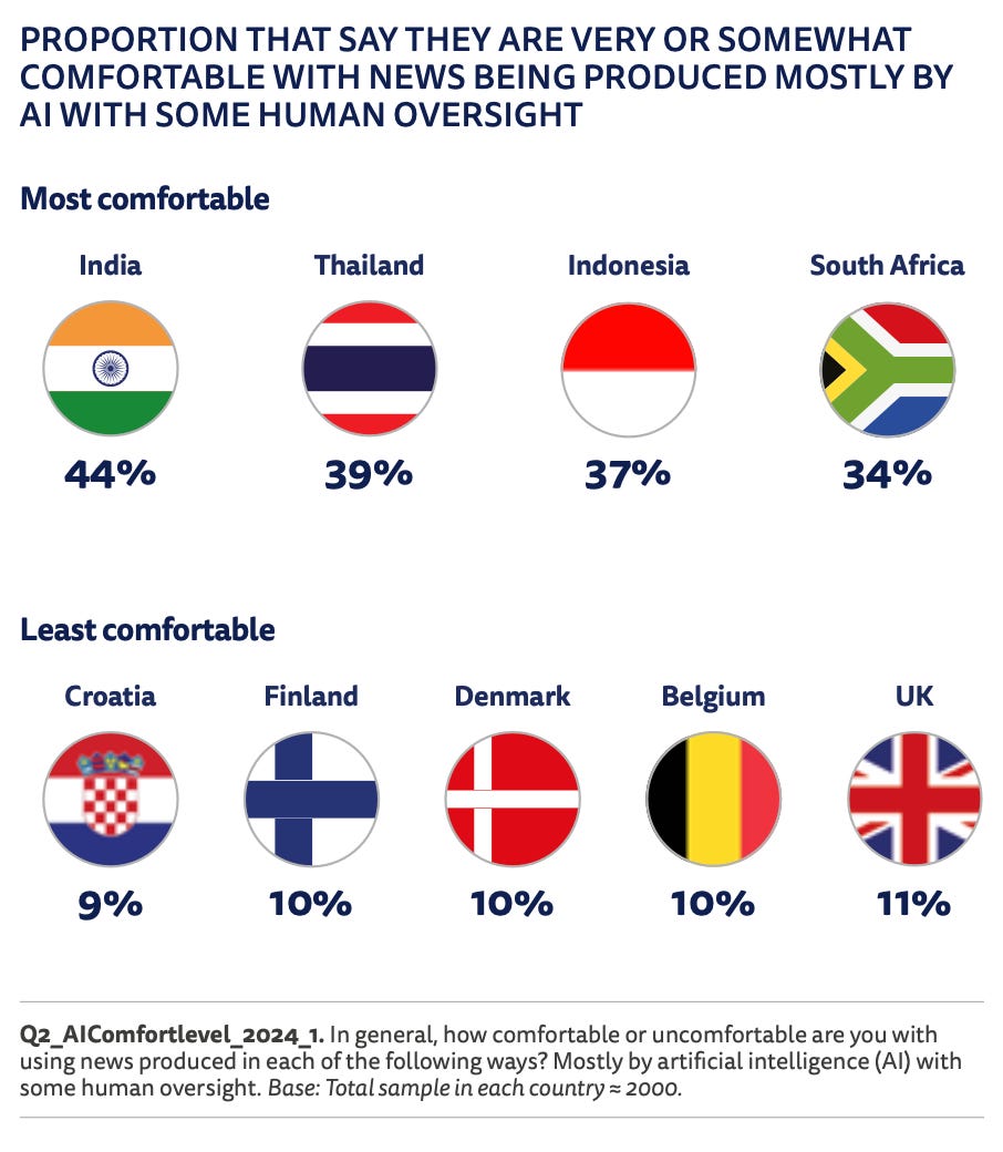 En la India, por ejemplo, un 44% aseguró que se sienten satisfechos o en calma con noticias producidas principalmente por la inteligencia artificial con supervisión humana.