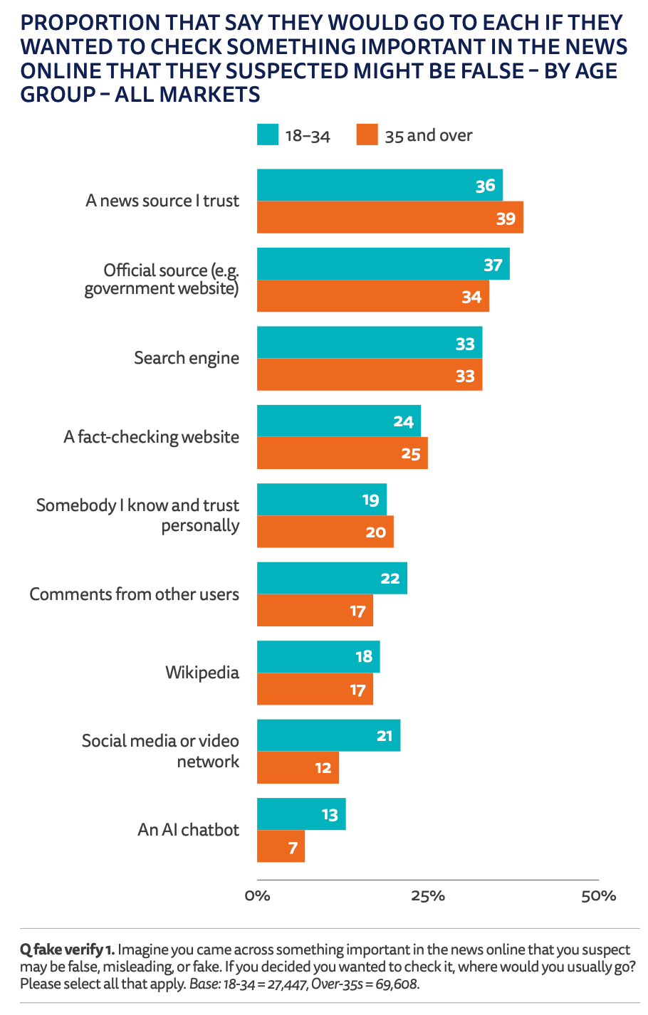 El porcentaje de jóvenes entre y 18 y 34 años que indicaron que irían a un chatbot para confirmar si un contenido es falso o verdadero es casi el doble (13%) que el 7% de los usuarios de 35 años o más.
