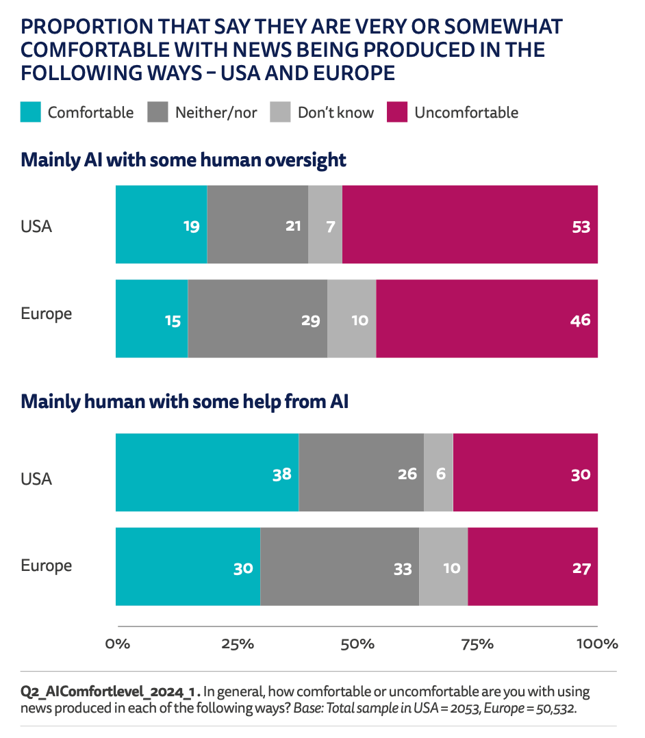 En Estados Unidos un 53% aseguró no sentirse cómodo con contenido hecho principalmente por inteligencia artificial.
