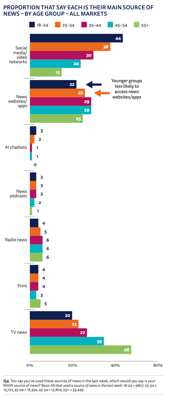 En todos los mercados, el 44% de las personas de 18–24 años dicen que su fuente principal de noticias son las redes sociales o plataformas de video.