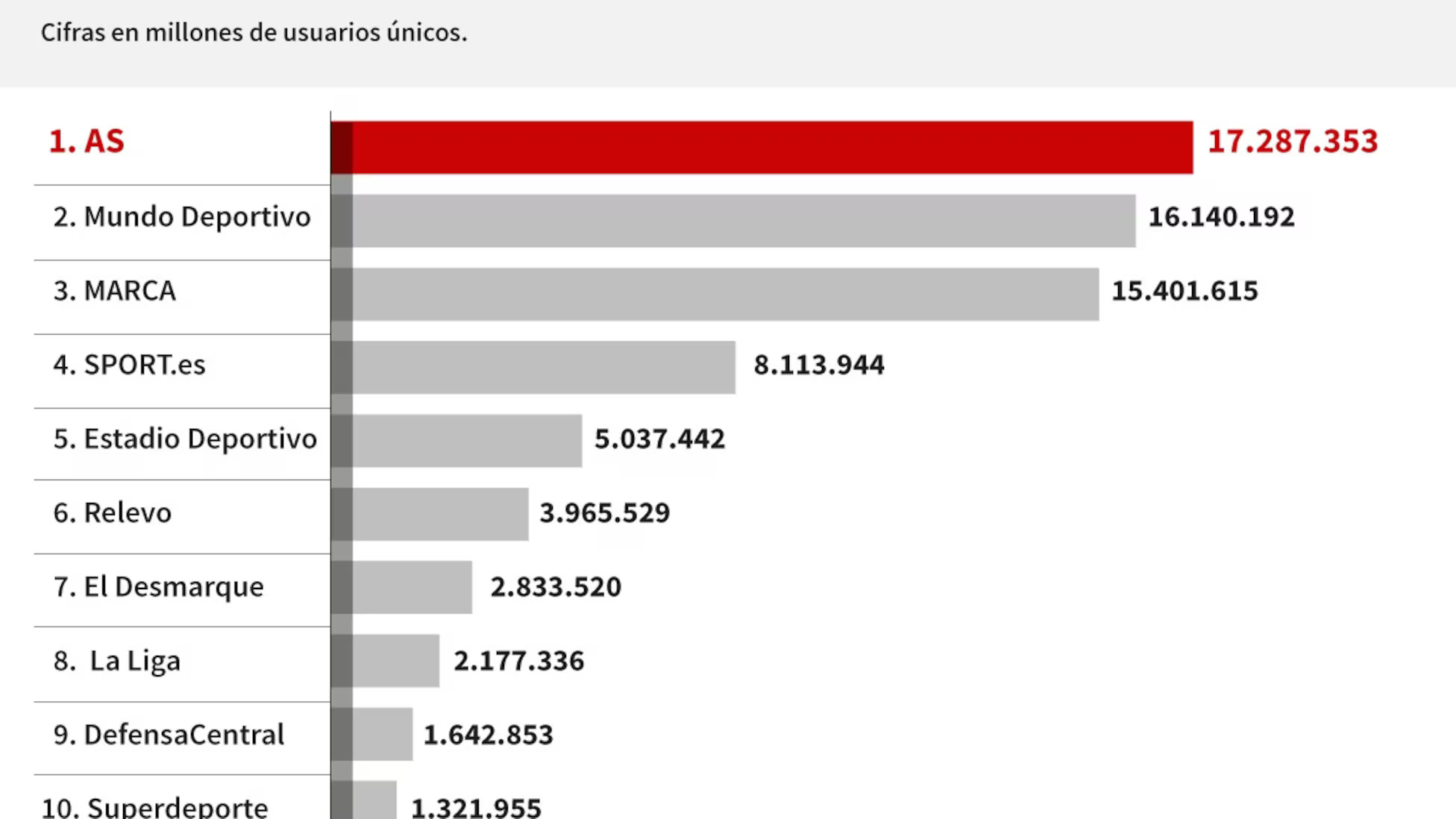El medio amplía la distancia frente a sus principales competidores. Mundo Deportivo ocupó la segunda posición con 16.14 millones usuarios únicos, mientras que Marca cerró el mes en tercer lugar con 15.4 millones.