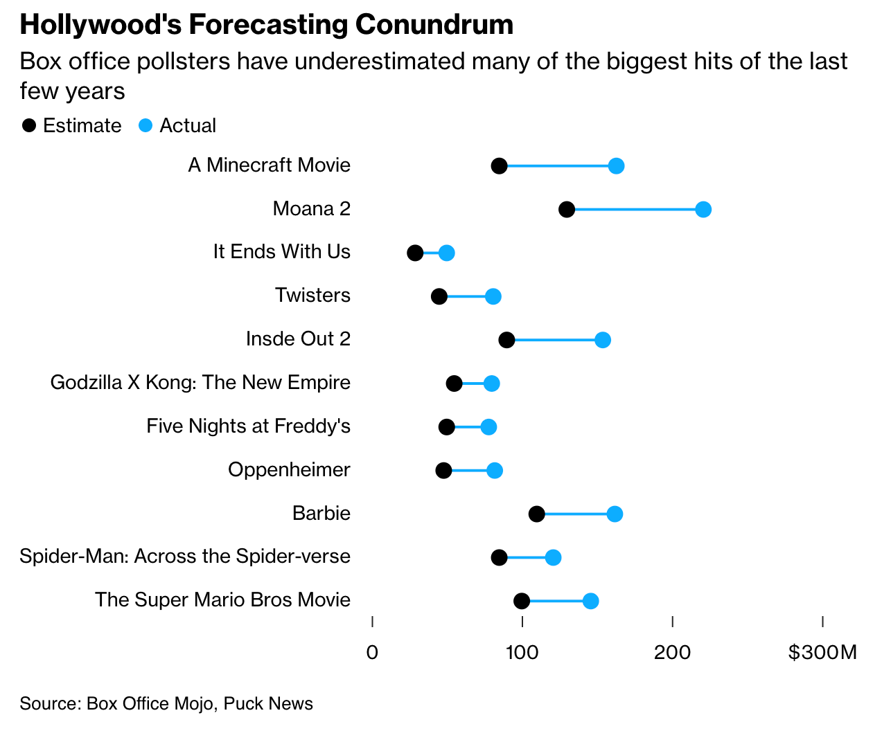 Esta gráfica compartida por Lucas Shaw demuestra cómo la industria ha fallado al pronosticar los más grandes éxitos recientes.