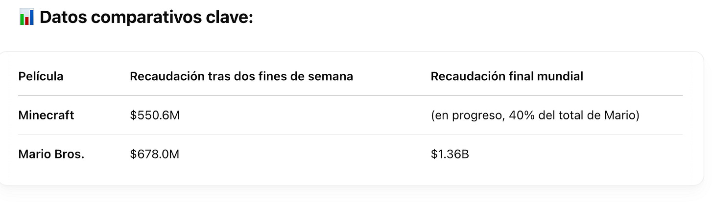 En un futuro, para efectos comparativos, es probable que hablemos más de cómo le ha ido al universo cinematográfico de Minecraft frente al de Roblox o de Fortnite que frente al universo de Mario Bros. y otros personajes de Nintendo.